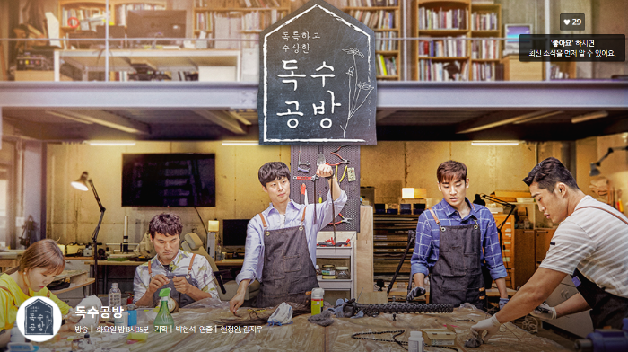 POOQ(푹) 사이트에 다른 예능 프로그램을 보러 들어갔다가 9월 25일에 첫 방송을 시작한 따끈따끈한 신작 예능! 독수공방을 보게 되었다. (추석특집으로 한 번 한 방송이었는지, 앞으로 정규편성이 될 방송인지는 잘 모르겠다) 딱 봐도 무언가를 만들겠구나 싶게 앞치마를 입은 사람들이 있는 포스터 사진을 보고 망설임 없이 클릭을 눌렀다.